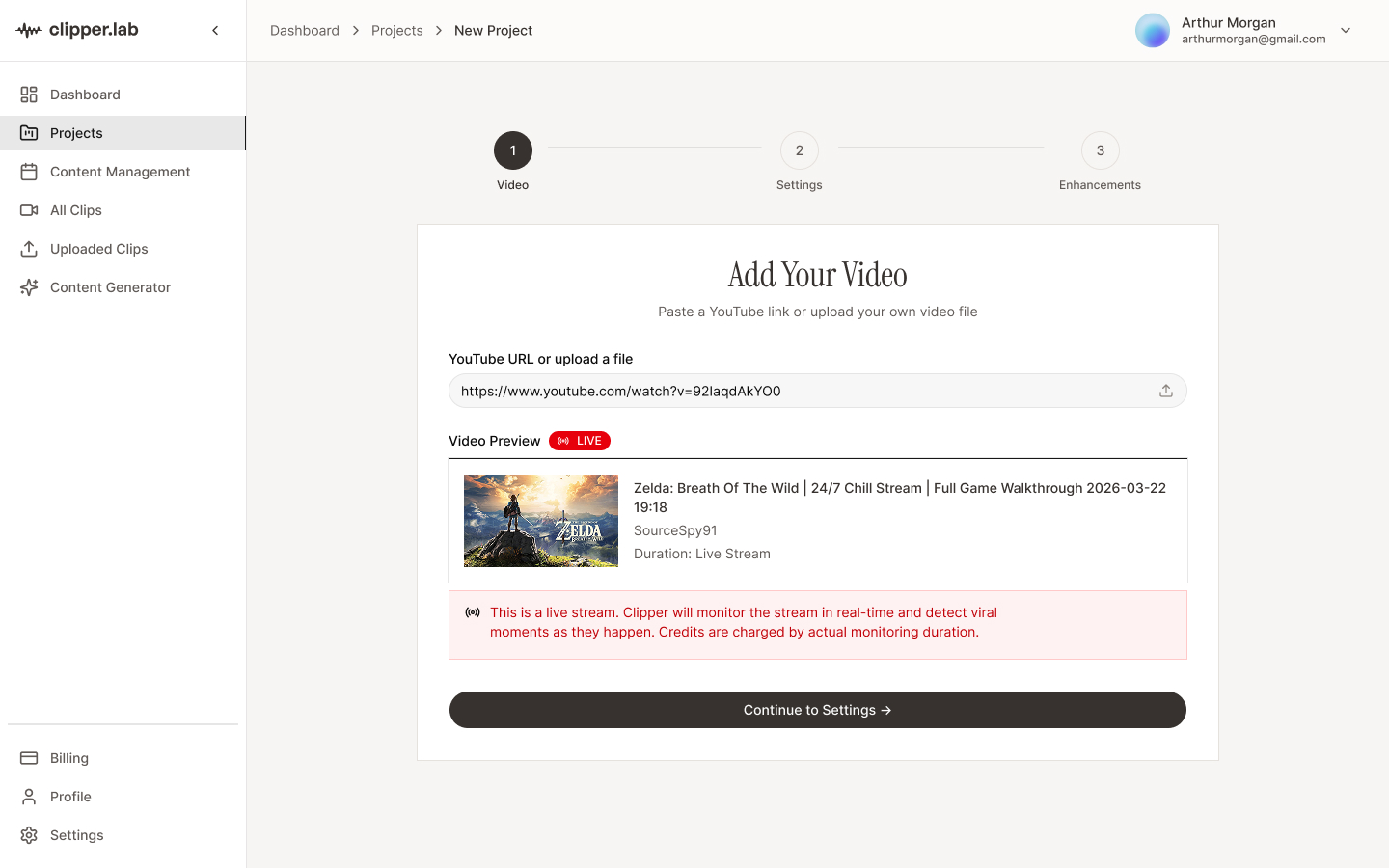 Connect your YouTube or Twitch stream. Or drop in a video you already recorded. ClipperLab connects instantly.