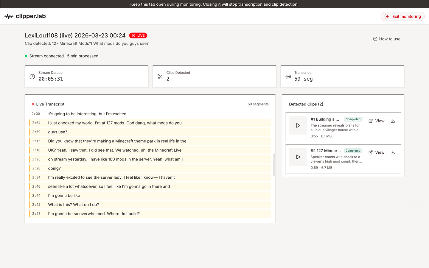 ClipperLab watches for big reactions, quotable lines, and peak energy — and clips them automatically.